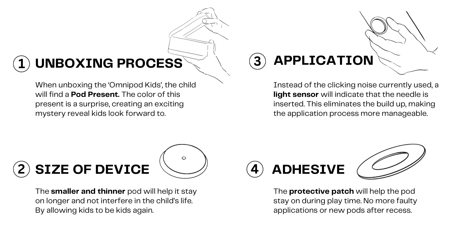 How might we redesign the Omnipod for kids to reinvent the process of applying the device. By creating a fun experience that builds confidence and eliminates fear. Allowing kids to be kids again.